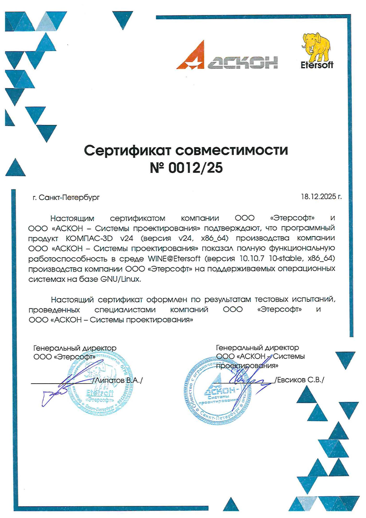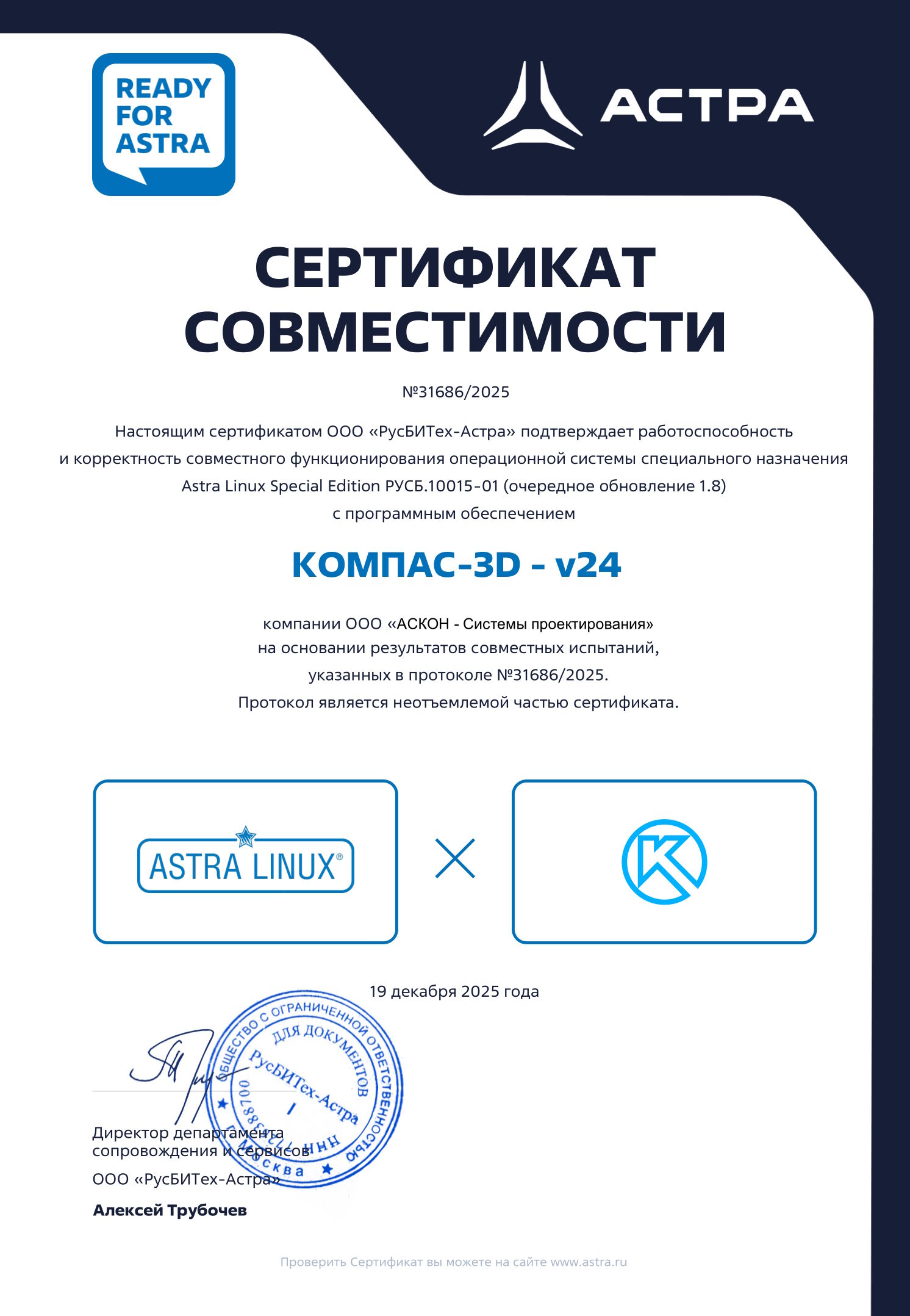 Сертификат совместимости ВЕРТИКАЛЬ и СУБД Postgres Pro