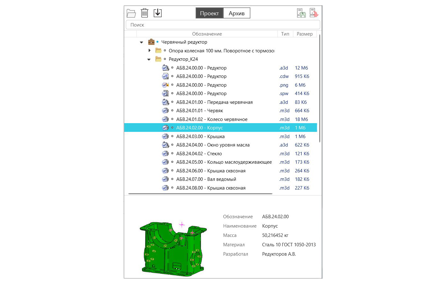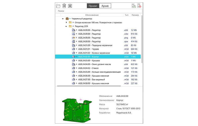 ЛОЦМАН:КБ 24 научился быстро искать нужный файл, когда его имя не совпадает с атрибутами изделия. Теперь при сохранении файла в базу данных система сразу отображает ключевые атрибуты изделия из CAD-системы: обозначение, наименование, массу, материал, ФИО разработчика и формат. Для группового изделия выводится количество его исполнений. Это ускоряет поиск и идентификацию данных.