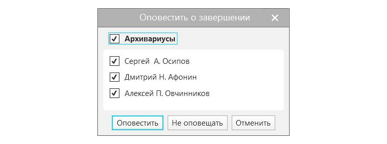 Система выборочно оповестит пользователей с правами архивариуса о готовности состава изделия к переводу в архив.