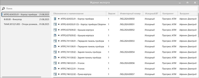 Журнал экспорта содержит события передачи данных, обеспечивая полную прослеживаемость. Для выгрузки конструкторской документации в производство или внешним подрядчикам система фиксирует всю служебную информацию: кто и когда выполнил экспорт, какие версии документов были включены в пакет и кому он предназначался. В журнал автоматически записываются детали по каждому выгруженному файлу, включая исходные CAD-файлы и их PDF-представления.