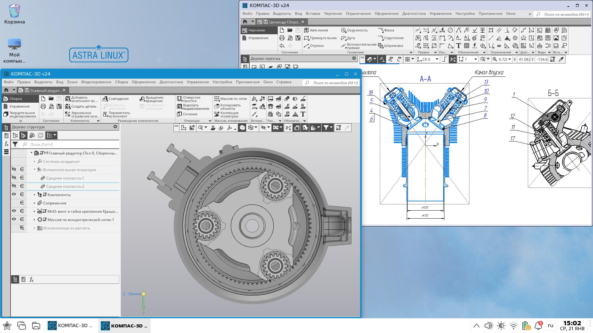 КОМПАС-3D широко используется для проектирования изделий основного и вспомогательного производств в машиностроении, авиастроении, судостроении, приборостроении, металлургии, а также в промышленном строительстве и других отраслях. Система предлагает инженерам развитый инструментарий трехмерного моделирования, в том числе объектного, поверхностного, твердотельного и листового; поддерживается прямое редактирование геометрии и обмен данными с другими CAD-системами. Продукт базируется на отечественном геометрическом ядре C3D, также сертифицированном для работы с Astra Linux.