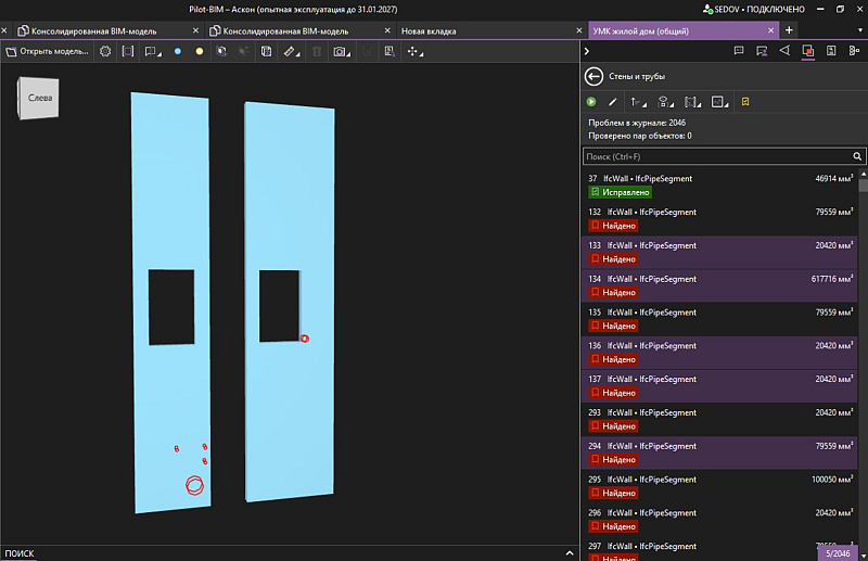 Удобнее стало работать и с результатом проверок. Во-первых, поиск по наименованию IFC-класса стал более точным: найти коллизию в журнале теперь можно не только по одному элементу, но и по двум, участвующим в пересечении. Во-вторых, можно выделить в журнале и на сцене одновременно несколько пересечений, чтобы, например, визуально оценить взаимное расположение разных коллизий в модели.