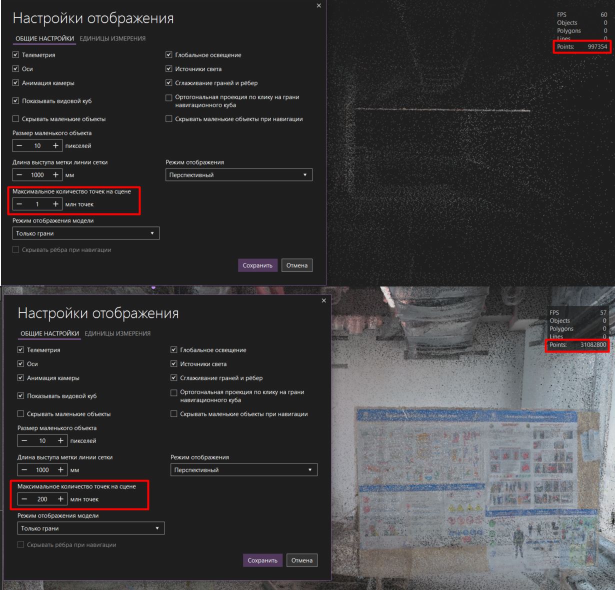 Теперь пользователи могут управлять количеством точек, одновременно находящихся на 3D-сцене. Это позволяет не перегружать ресурсы рабочего места избыточной информацией, как следствие — ускоряет загрузку облаков и сделает перемещение по сцене комфортнее даже при работе с большим количеством точек на средних по характеристикам компьютерах.