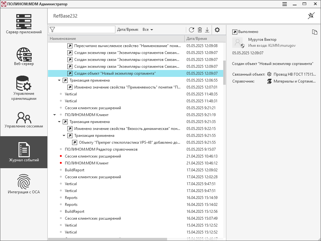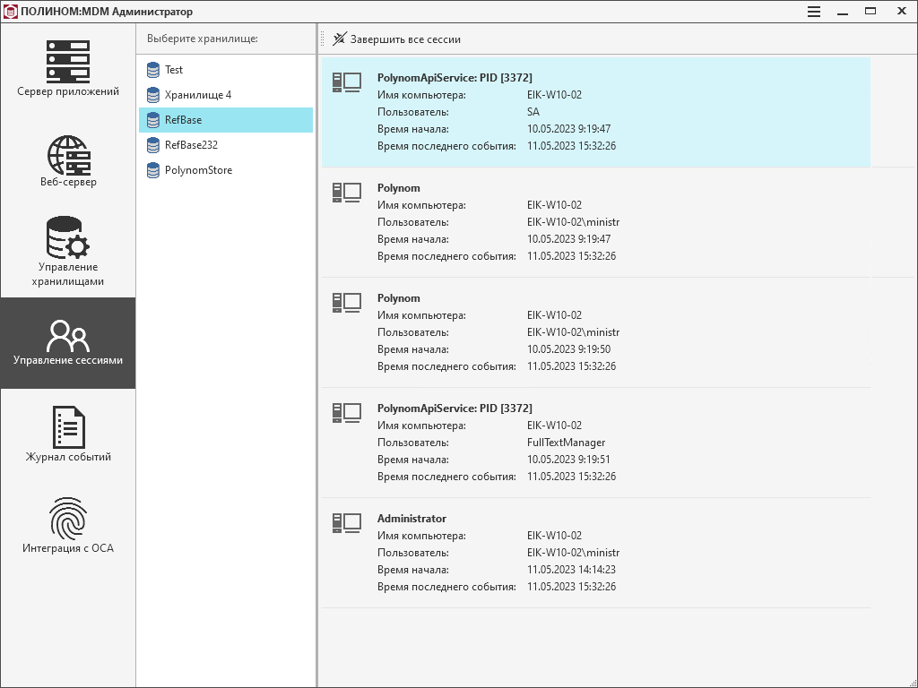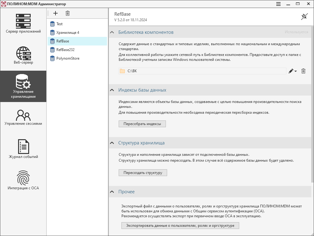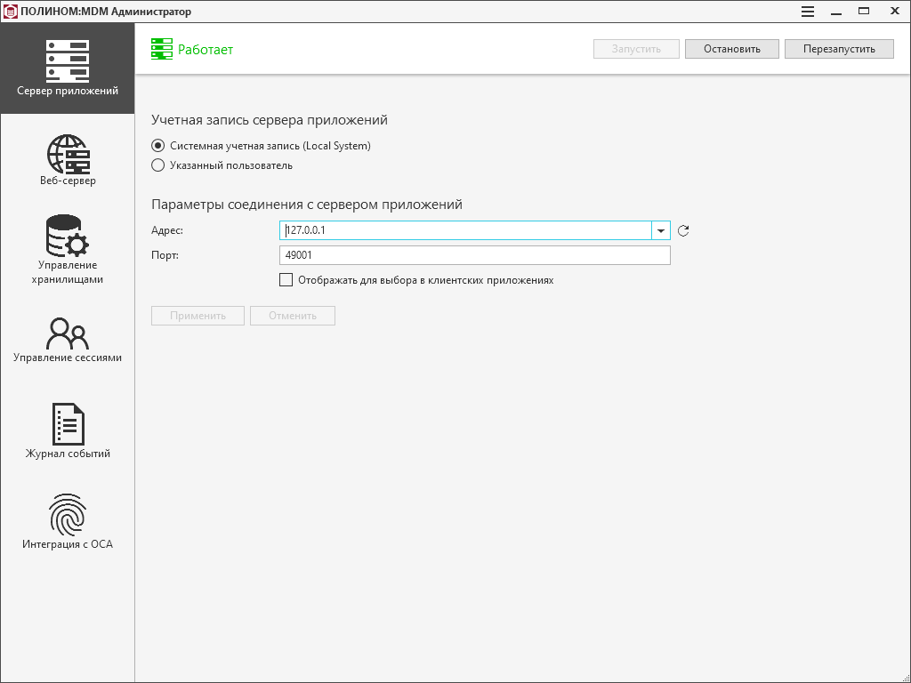 Приложение предназначенное для системного обслуживания ПОЛИНОМ:MDM: создание и управление базами данных системы, настройка сервера приложения для взаимодействия с клиентским приложением, управления пользовательскими сессиями, доступ к журналу действий пользователей.