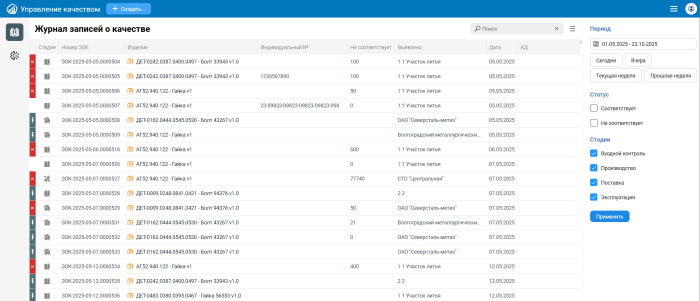 Отображает записи о качестве с учетом условий поиска и фильтрации: