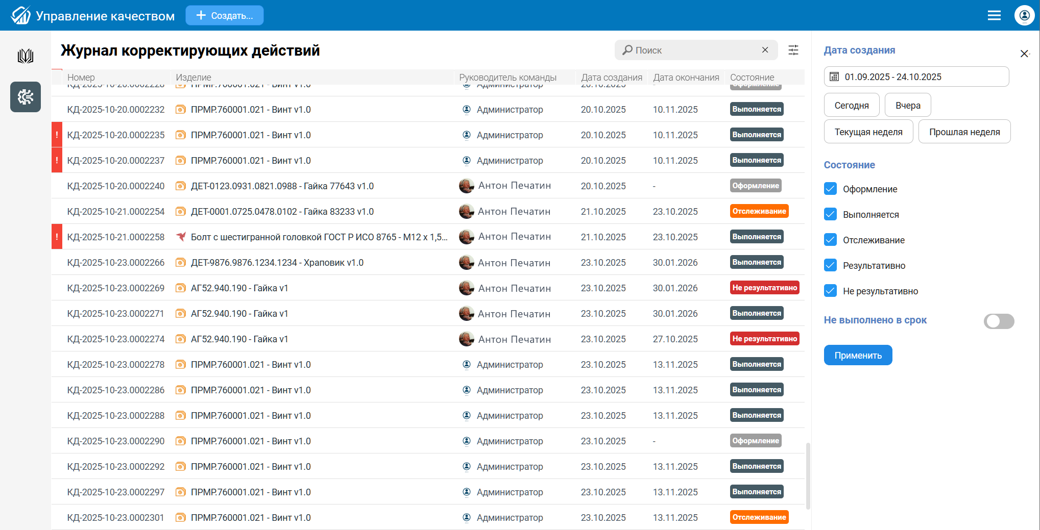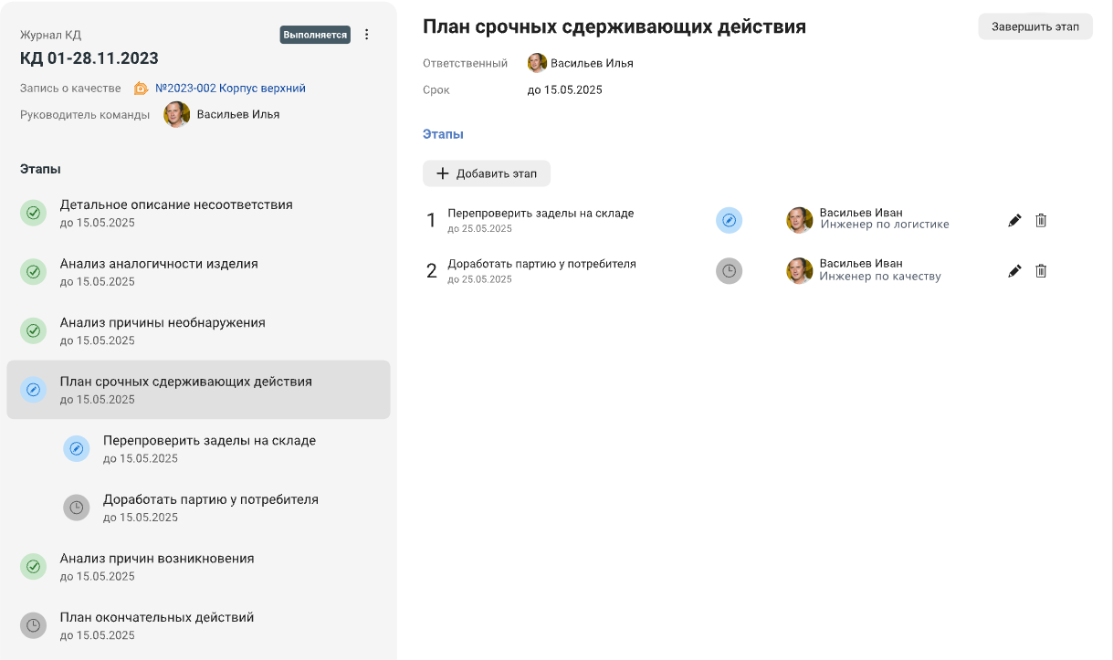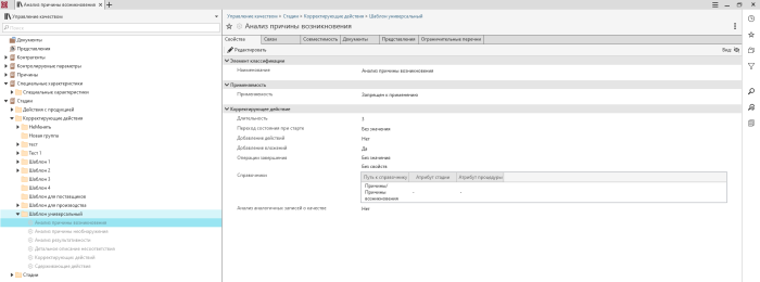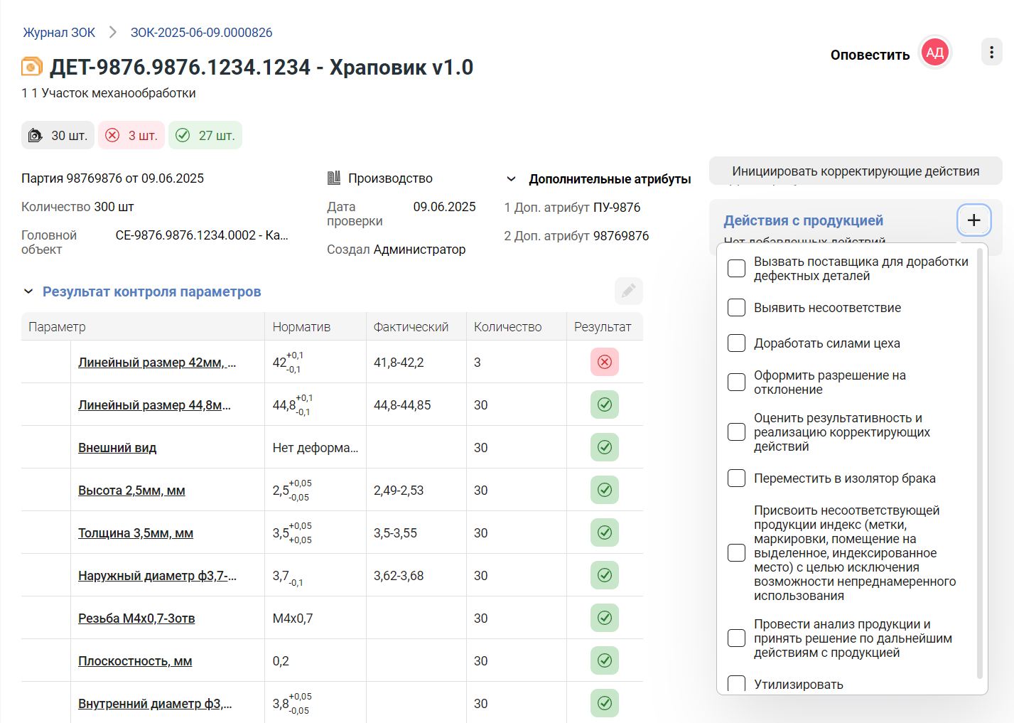 Проводя проверки продукции на данных стадиях, специалисты заносят информацию в систему. Если в проверяемом образце, выборке, партии выявляются несоответствия по качеству продукции, то в системе возможно инициировать процедуру корректирующих действий, которая призвана устранить как последствия так и причины возникновения несоответствий.