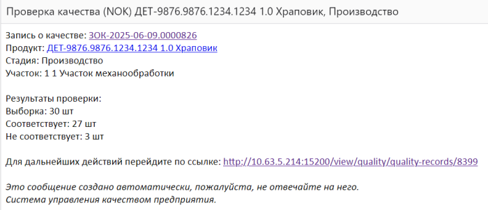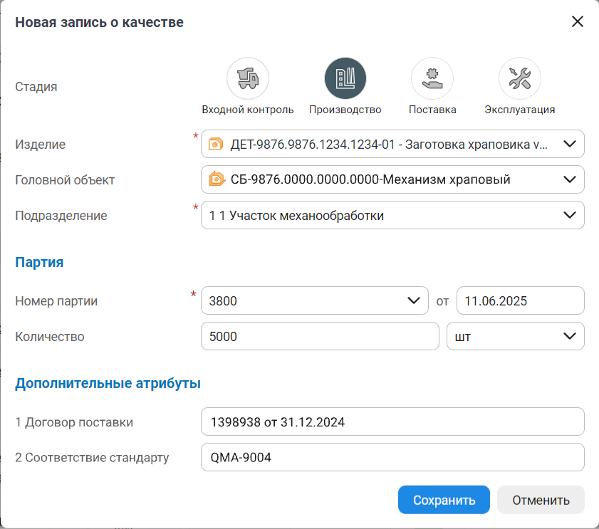 Каждый факт проверки качества продукции заносится в систему в виде Записи о качестве, которая содержит: