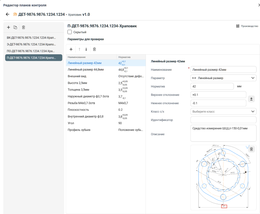 При проведении любых контрольных, измерительных, испытательных операций необходим перечень контролируемых параметров, их нормативные значения и технология проверки. Если изделие сложное, то контролируемых параметров будет несколько. Определить их, описать порядок контроля возможно в редакторе создав План контроля, который привязан к конкретной номенклатурной позиции и стадии жизненного цикла.