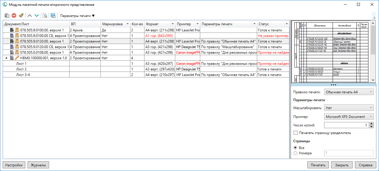 Система также предоставляет возможность пакетной печати 2D-документов на основе универсального формата PDF с гибкой настройкой правил.