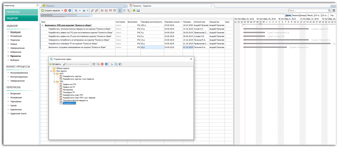 Система позволяет сформировать план в виде структуры взаимосвязанных работ, связать задачи между собой, задать плановые сроки выполнения, назначить исполнителей, приоритеты. Отображение плана работ возможно как в виде списка, так и в виде диаграммы Ганта, что дает более наглядно определить сроки и конфликты по задачам.