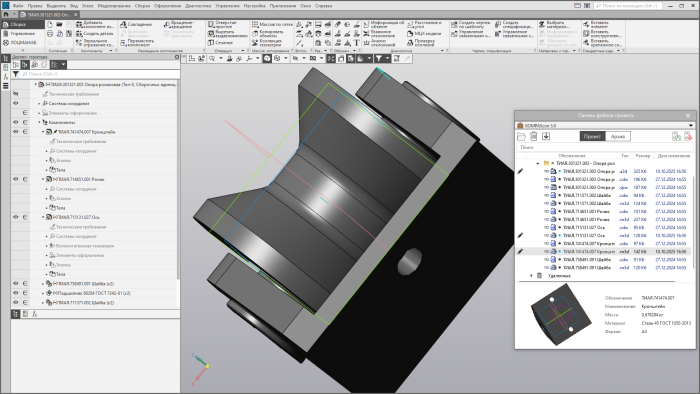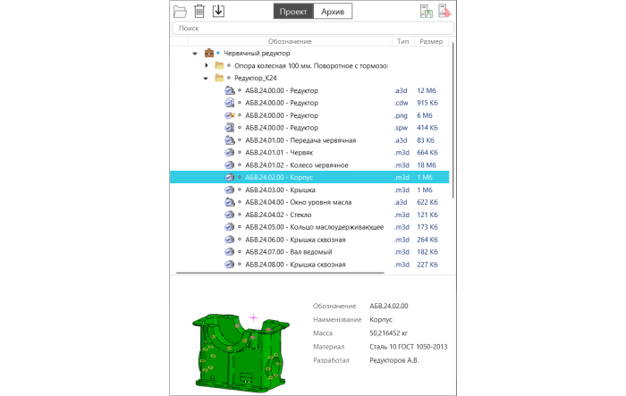 Это отличительная особенность ЛОЦМАН:КБ. Известные на рынке PDM-системы предлагают оперировать только электронной структурой изделия но, как показывает практика, работа с файлами не менее актуальна. Кроме того, файловый архив является хорошей функциональностью для обеспечения комфортного перехода от работы в локальных/сетевых ресурсах к PDM-системе. Конструктор сохраняет привычную среду работы с папками и файлами, но при этом пользуется дополнительными возможностями: просмотром атрибутов изделия и вторичного представления документа, сохранение всех промежуточных версий файла и другими.