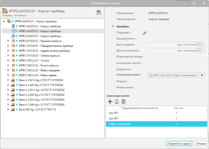 Согласованную документацию, инженер-конструктор с правами архивариуса из проекта переводит в архив, где она доступна для просмотра всем пользователям. При переводе, у каждого документа доступна к заполнению инвентарная карточка. Для 2D-документов возможно сгенерировать инвентарные номера с помощью нумератора.