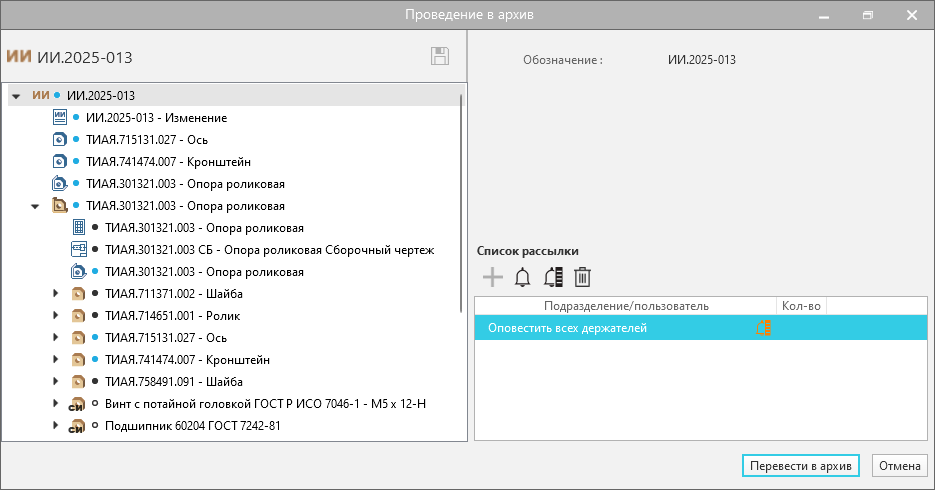 При проведении изменений может иметь место ситуация, когда изменяемое изделие уже используется в нескольких проектах другими пользователями. Поэтому, инициатор изменения перед переводом в архив может воспользоваться специальной командой «Оповестить всех держателей» чтобы они смогли своевременно актуализировать документацию.