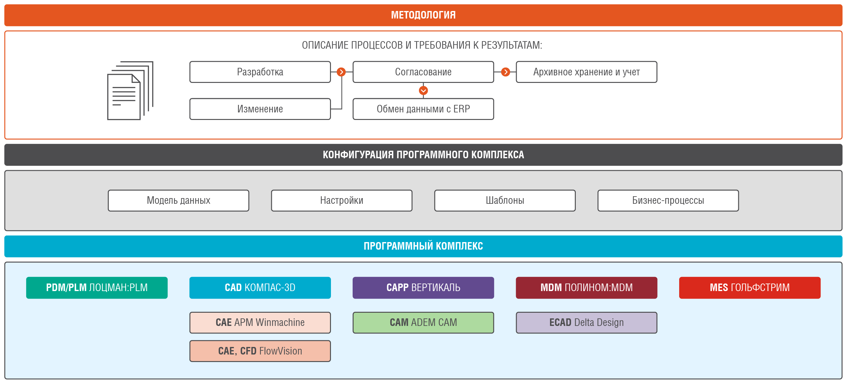 Основу бизнес-решения CT3D составляет методология, которая содержит определения терминов предметной области, классификацию и описание процессов жизненного цикла изделия, выполняемых различными службами предприятия с использованием программного комплекса АСКОН, а также требования к документации и данным.